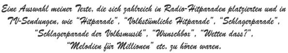 Endlos ist die SehnsuchtUnser SternDu bist ein Teil von mirWegen DirBodyguardLorySchwarze SchwäneKinder sind wie SonnenblumenSeit es Dich gibtDu fehlst mirDie Dornen der gebrochenen RoseAuch Diamanten haben KantenDas kleine GlückDer große TraumIm Schatten des FeuersNocheinmal FrühlingIch will Dich totalKleine SpieluhrWer Champagner aus dem Bierglas trinktDu hast 1000 Wünsche freiQuo VadisIm Abendrot von SantoriniDie Sehnsucht nach DirUnter fremden SternenAnn CathrinNachhause kommenDolce Vita & HerzgefühlErinnerungEin Gefühl wiederfindenZwischen diesen Zeilen FélicitéMelodie einer zärtlichen LiebeFreundeMein Weg zu Dir Eine Rose für DichIch hab’ den Himmel riskiertEin Sonntag ohne DichMach mir wieder MutRäum erst Dein Herz aufFloMein Herz liegt auf der BühneDu gibst mir soviel von DirDas trifft sich gutImmer wiederTommySilbervogel****Teufel im SeidenkleidDich muss man liebenNur noch gut draufSpiel kein Spiel mit mirTotal verknalltIch denke oft an Texas